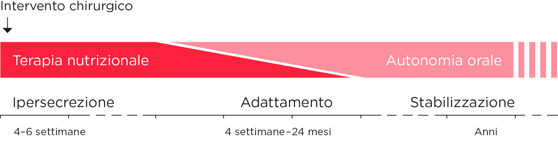 La fase di adattamento ha un decorso individuale estremamente variabile e dipende da vari fattori, tra cui lo sviluppo e la struttura del tratto intestinale dopo l’intervento. La fase di adattamento può durare fino a due anni, in rari casi anche più a lungo.